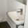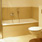 mit sandsteinfarbenen Fliesen versehen. Duschtasse und Waschtisch von