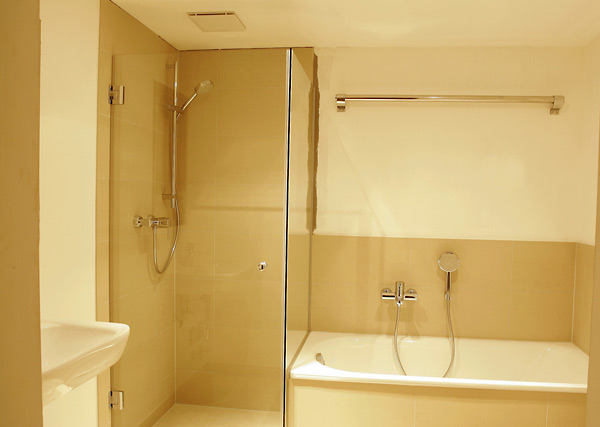 Glastür versehen. Das Waschbecken und die Dusche werden im Spritzbereich
