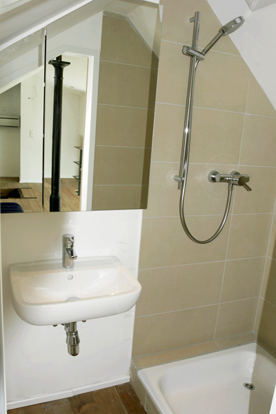 mit Dusche und zusätzlichem WC. Im Loft ist unterhalb der Treppe direkt