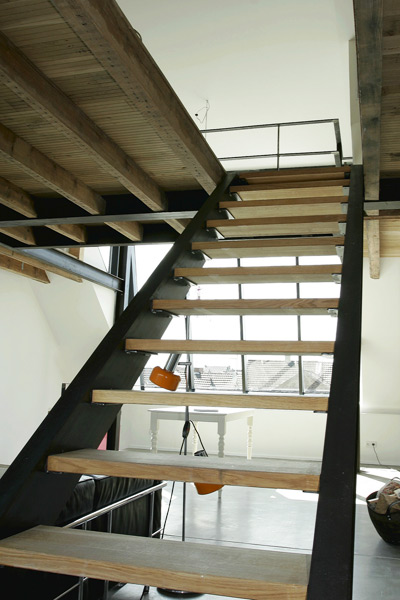 und duch eine nach oben führende mit schwarzen Stahlwangen in U-Profil