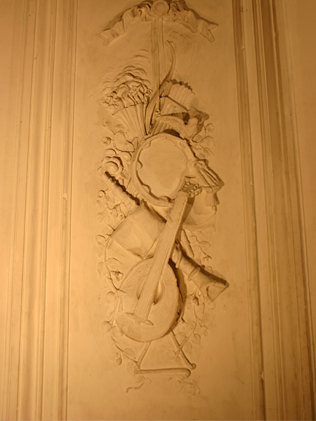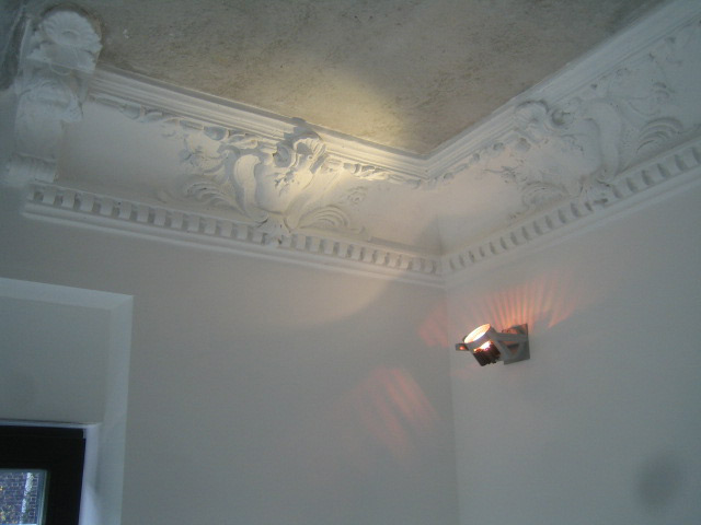 Im Wohnzimmer wird einfacher Stuck (Hohlkehle und Deckenrosetten) ergänzt.
